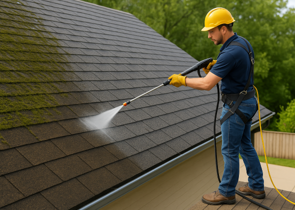 Our roof treatment service targets moss, lichen, mould, and algae using a safe, low-pressure application. The treatment gently breaks down growth over time, restoring your roof’s appearance and helping extend its lifespan. Ideal for keeping your roof clean, healthy, and well-protected without harsh water blasting.